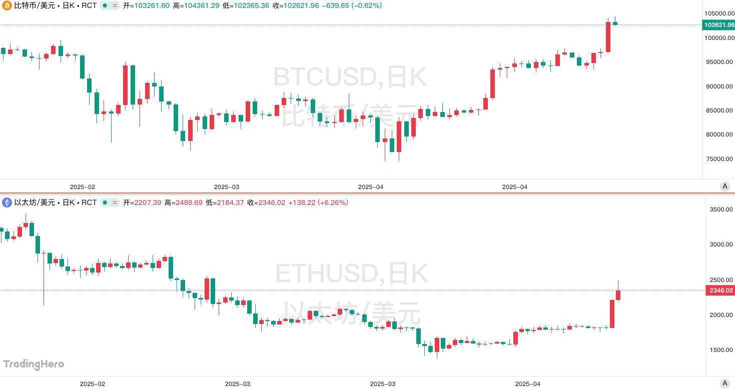 受美国贸易紧张局势缓等消息提振,比特币周三、周四连续上涨,重回10万美元上方;第二大代币以太坊在周五一度逼近2500美元。